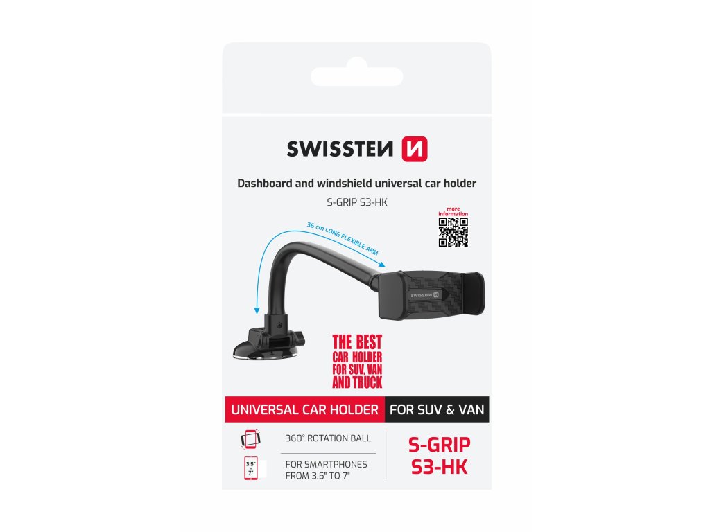 Držák SWISSTEN S-GRIP S3-HK je ideálním řešením pro všechny, kteří hledají spolehlivé a flexibilní uchycení telefonu v autě. Díky extra dlouhému hliníkovému husímu krku o délce 36 cm snadno nastavíte telefon do ideální polohy pro sledování navigace či pohodlné ovládání.