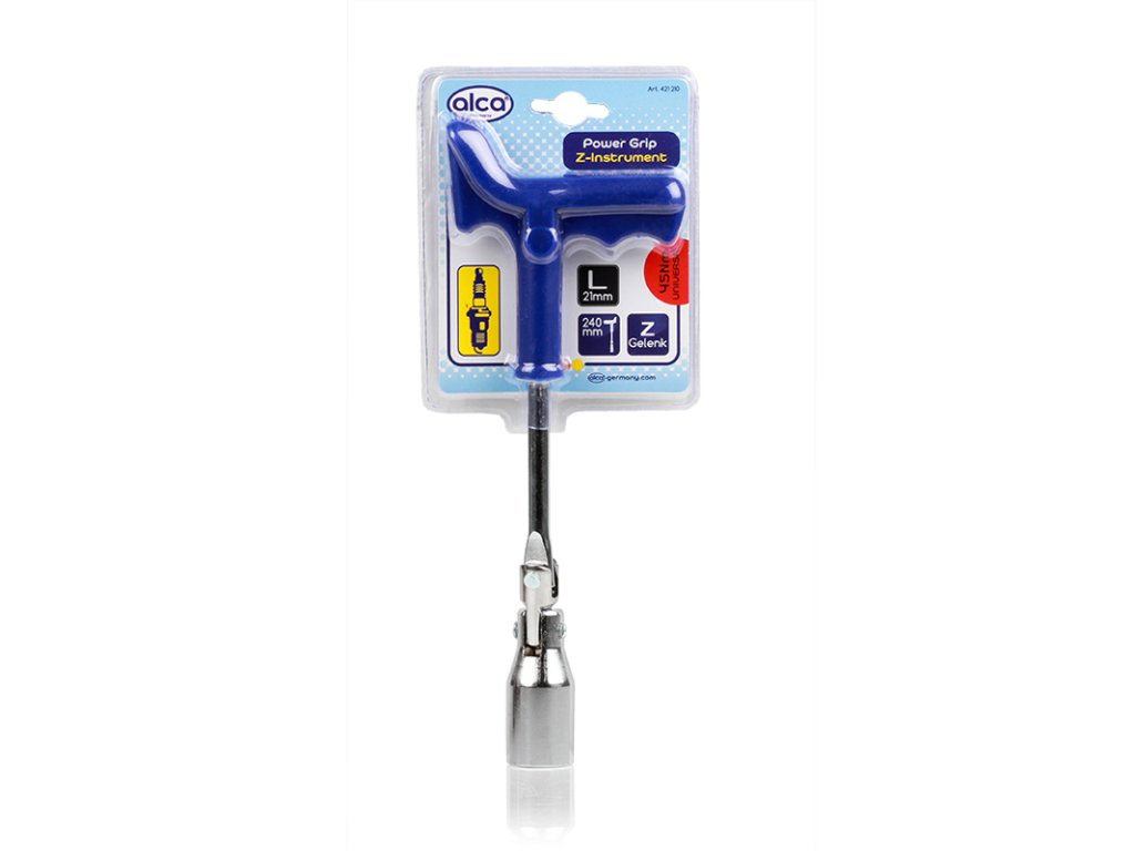alca® Power Grip Z-Instrument je výkonný a odolný klíč na zapalovací svíčky o velikosti 21 mm. Vyznačuje se otočným Z-kloubem, který výrazně usnadňuje práci v těžko přístupných prostorech. Díky ergonomické rukojeti s protiskluzovým plastovým úchopem je manipulace pohodlná a bezpečná.