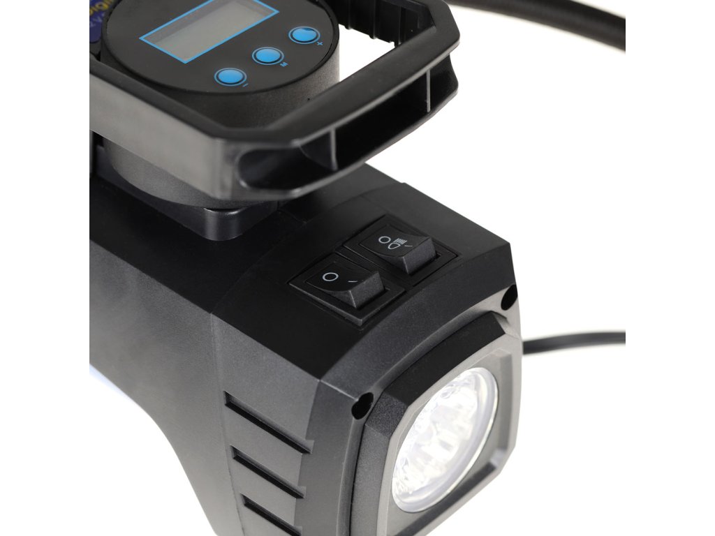 Tento vzduchový kompresor do auta 12V disponuje automatickým vypnutím při dosažení přednastaveného tlaku, což zajišťuje maximální bezpečnost a přesnost. Digitální manometr s podsvíceným displejem umožňuje pohodlné ovládání i za tmy. Díky LED svítilně je zařízení dobře použitelné i při snížené viditelnosti nebo v noci.