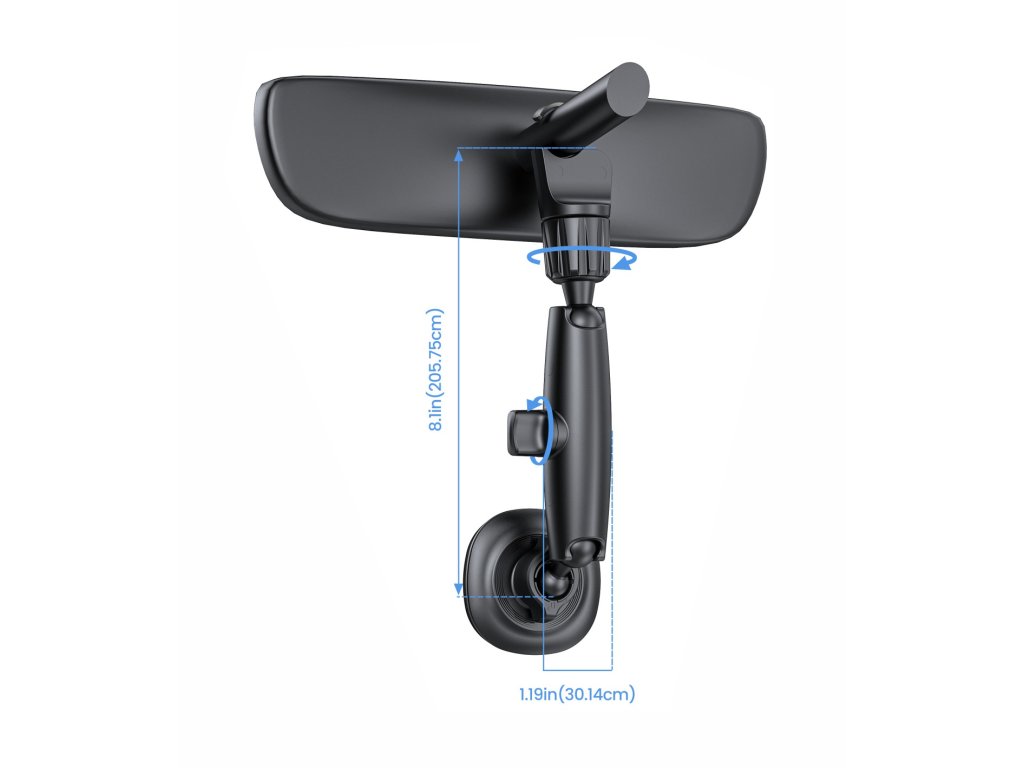 Držák je navržen pro uchycení přímo na zpětné zrcátko vašeho vozu. Upevňovací mechanismus umožňuje přichycení na tyčky o průměru 4,12–36,3 mm, což zajišťuje univerzální použití ve většině automobilů. Telefon tak máte stále na očích a přitom neomezuje váš výhled.