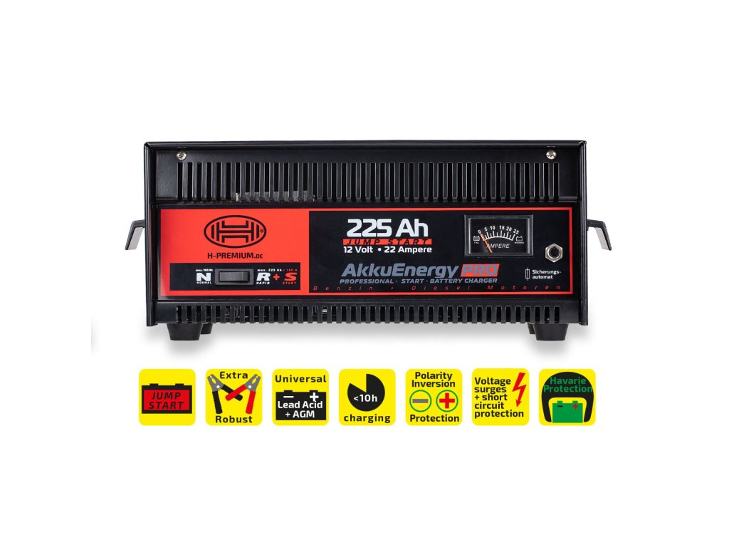 HEYNER® AkkuEnergy PRO je robustní a výkonné bateriové nabíjecí zařízení určené pro 12V olověné (Pb) a AGM baterie s kapacitou od 30 do 225 Ah. Díky kombinaci normálního a rychlého nabíjení a integrované startovací funkci je ideální volbou pro dílny, servisy i náročné domácí uživatele.