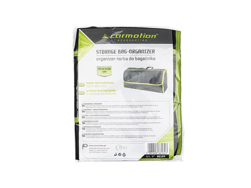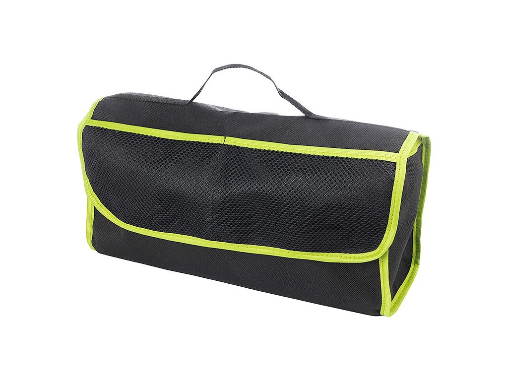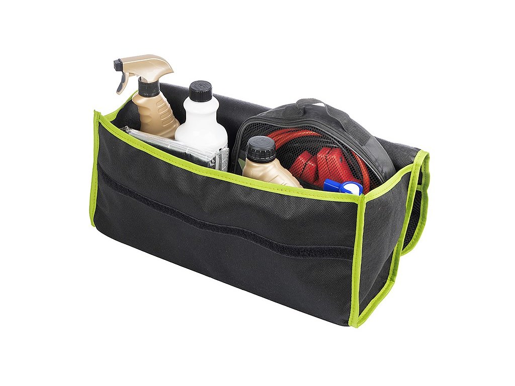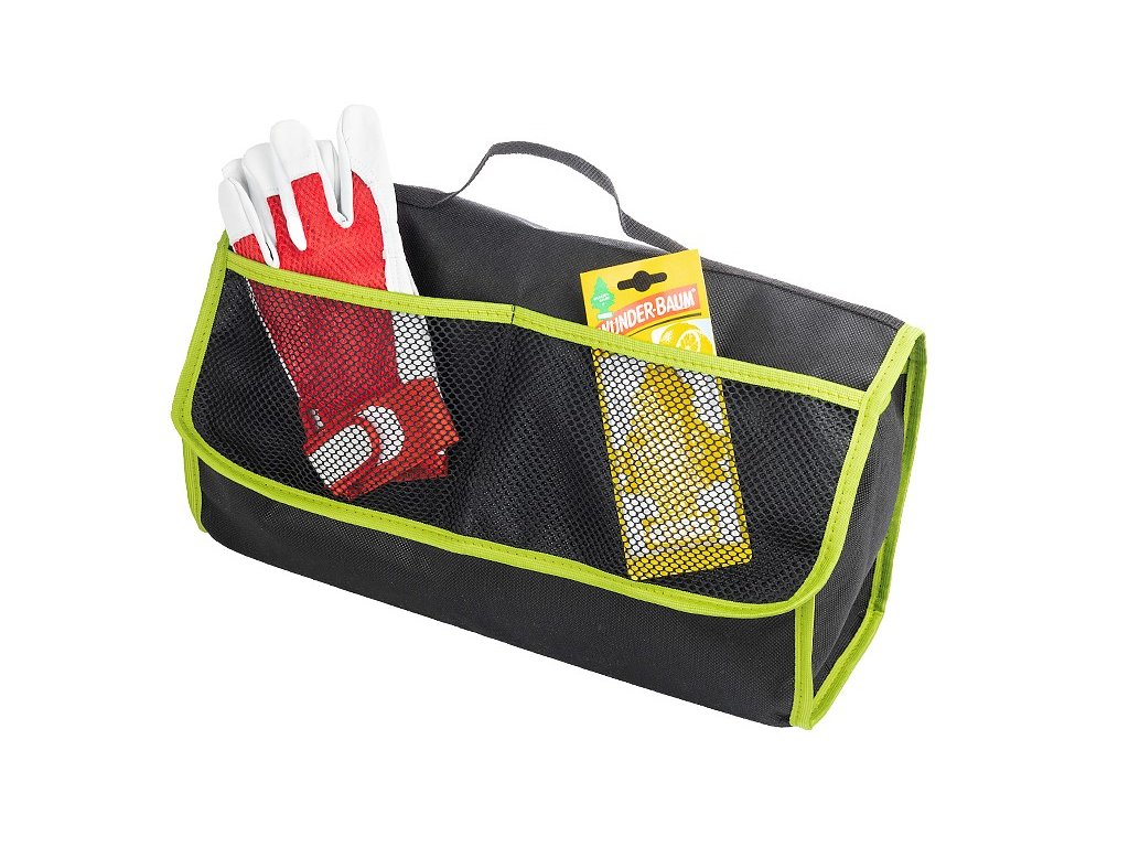 Praktický organizér do kufru pomůže udržet pořádek a bezpečně uložit vše potřebné při cestování. Je vyroben z odolného materiálu a nabízí prostornou hlavní komoru, kapsy z elastické síťoviny na víku a pevnou rukojeť pro snadné přenášení. Díky suchým zipům na spodní straně drží stabilně na čalounění kufru a zabraňuje nežádoucímu posouvání během jízdy.