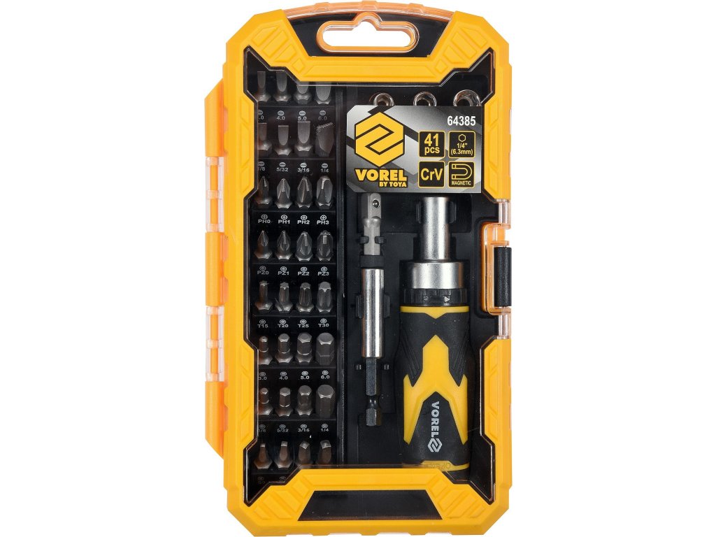 Nářadí je precizně zpracováno z CrV oceli a jednotlivé bity 1/4"(6,3 mm) jsou magnetické, čímž usnadňují práci se součástkami. Bytelné tělo ráčnového šroubováku je duté a po odšroubování zadní části je přístupné např. pro odkládání drobných součástek.