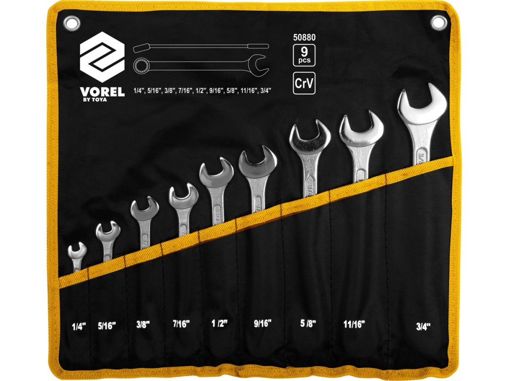 Klíče očkoploché sada 1/4" - 3/4" 9 kusů je sada klasických očkoplochých klíčů s palcovými (Inch) rozměry. Klíče jsou vyrobeny z kvalitní chromvanadiové slitiny oceli, s částečně leštěným a satinovaným povrchem. Pouzdro je z pevné syntetické tkaniny.