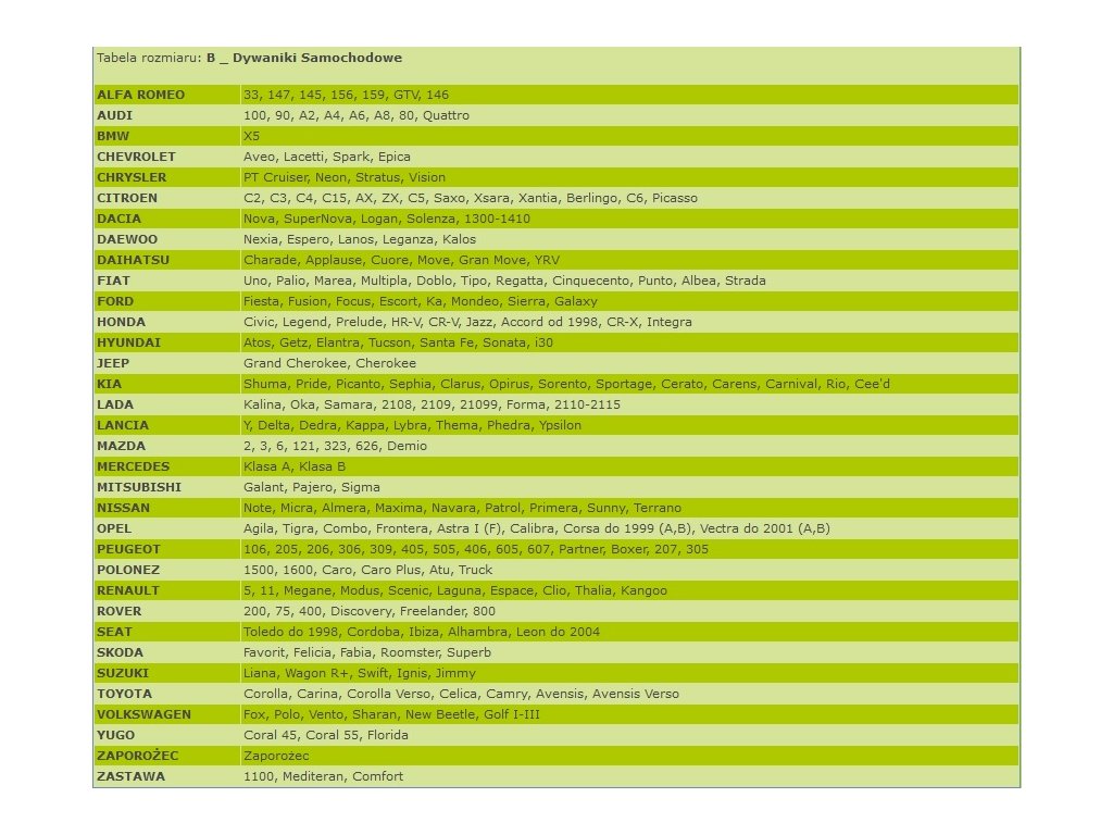 | FIAT | Uno, Palio, Marea, Multipla, Doblo, Tipo, Regatta, Cinquecento, Punto, Albea, Strada |