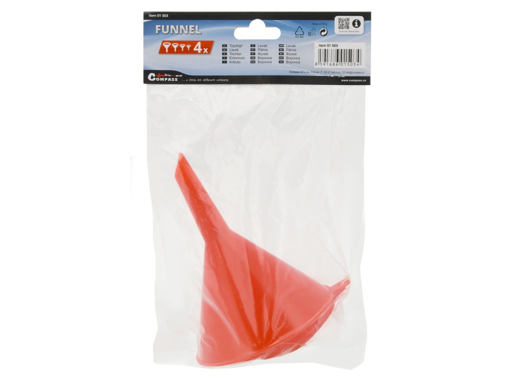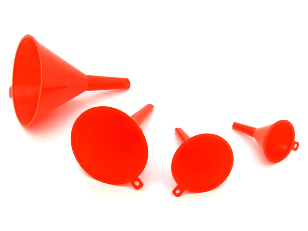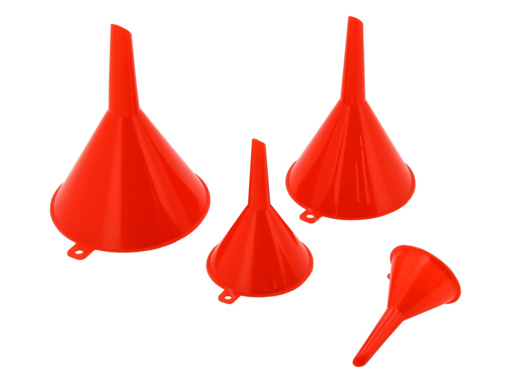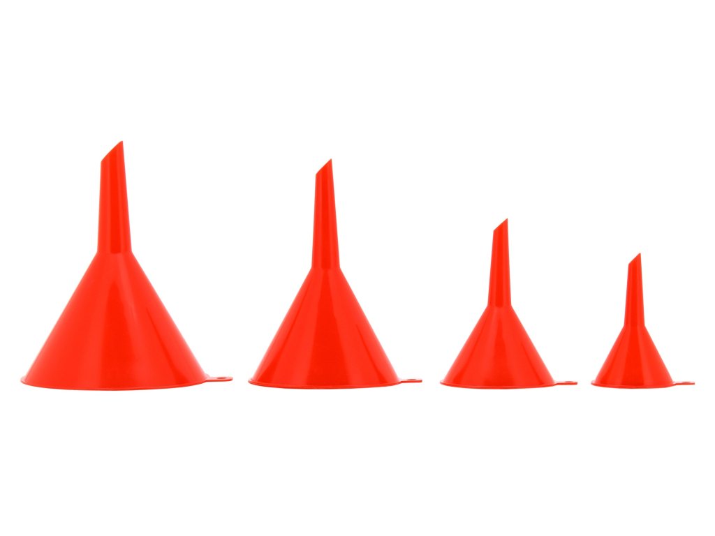 Univerzální čtyřdílná sada plastových trychtýřů je ideální pomocník pro snadné a čisté přelévání kapalin v dílně, garáži i domácnosti. Díky různým velikostem a tvarům si snadno vyberete ten pravý trychtýř pro každou situaci.