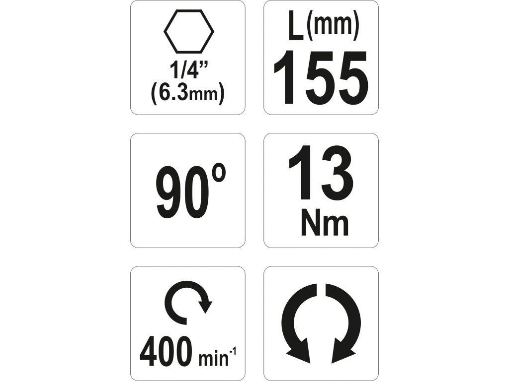 Adaptér má délku 155 mm s úhlem náklonu 90° a je vyroben z uhlíkové oceli s plastovým opláštěním. Zařízení je konstrouvané pro maximální točivý moment 13Nm a max. otáčky 400/min.