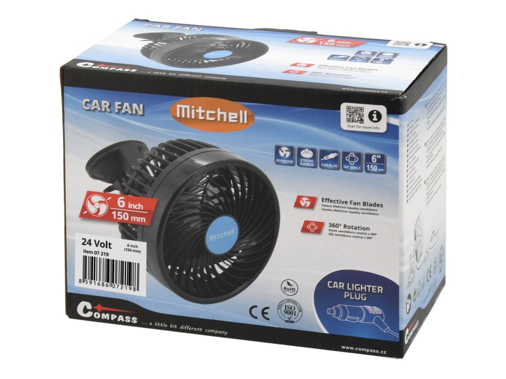 Napájení 24 V ze zásuvky autozapalovače. Ventilátor disponuje dvěma rychlostmi a díky kulovému kloubu je snadné větrák natočit prakticky jakýmkoliv směrem.