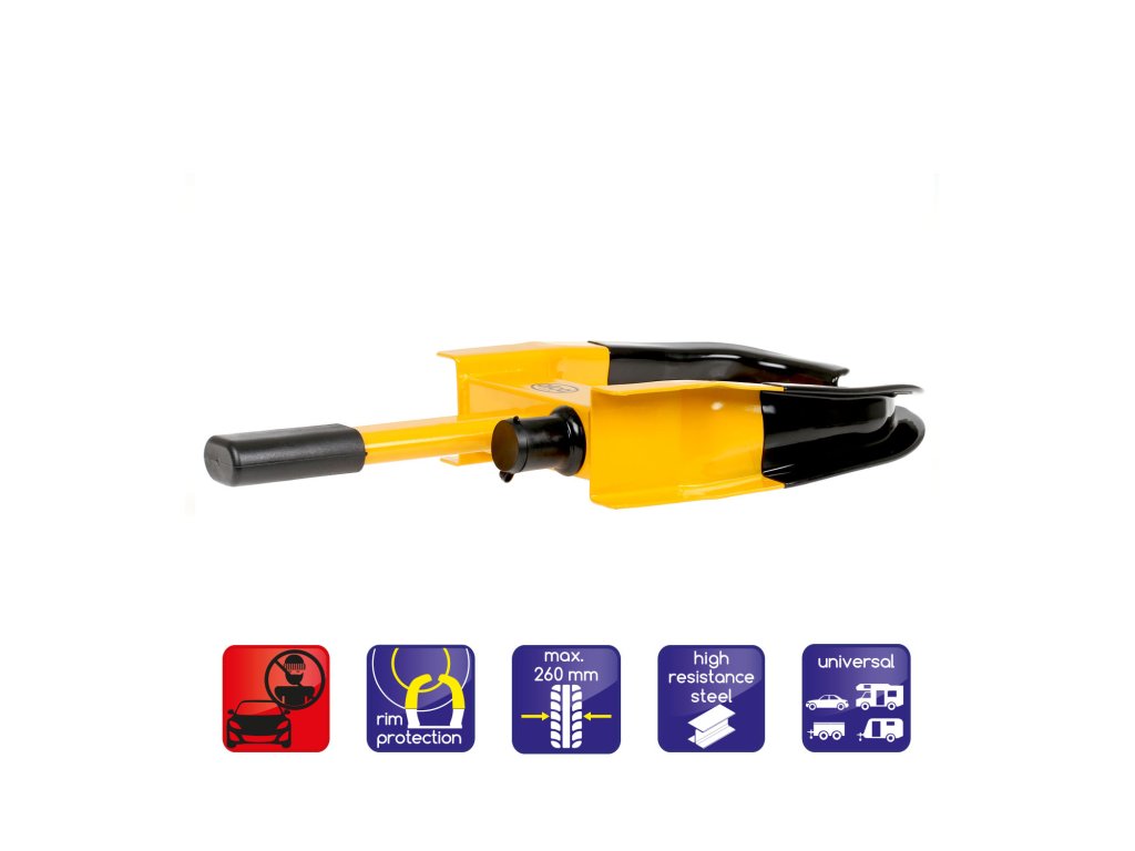 Radkralle je určena pro kola s maximální šířkou pneumatiky 260 mm. Díky odolnému provedení z kvalitní oceli a bezpečnostní úrovni 3 poskytuje vysokou míru zabezpečení. Proti poškrábání disku a poškození povrchů chrání guma na čelistech a PVC povrch rukojeti.